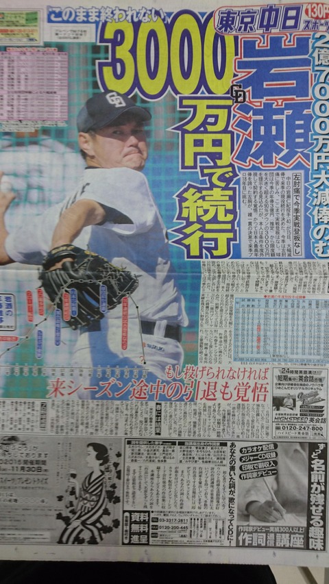 【速報】岩瀬3000万円で現役続行