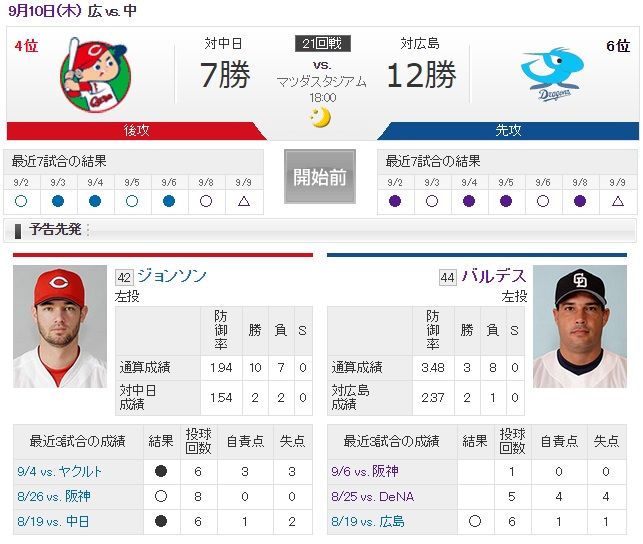 【実況・雑談用】 9/10 中日 vs 広島(マツダスタジアム)18:00開始