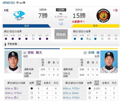 【実況・雑談用】 9/6 中日 vs 阪神(ナゴヤドーム)14:00開始