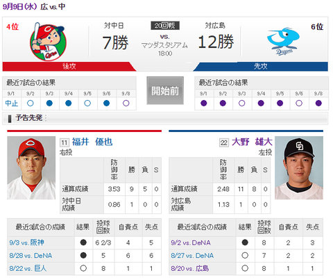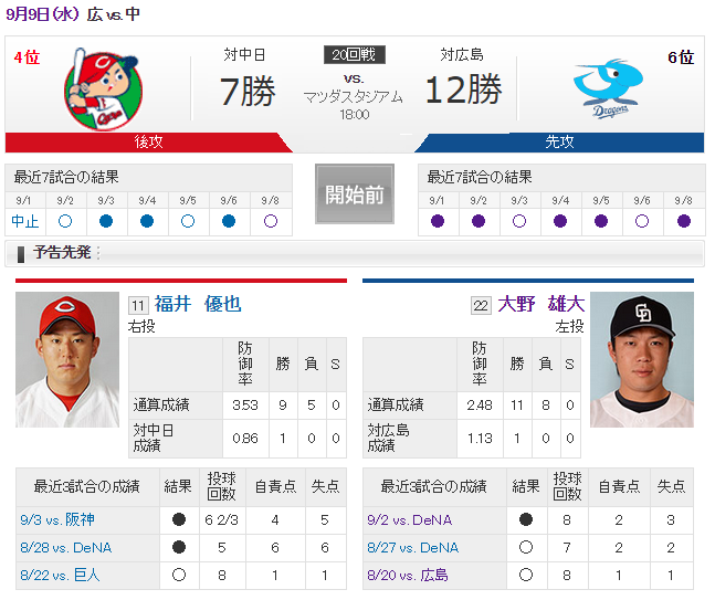 【実況・雑談用】 9/9 中日 vs 広島(マツダスタジアム)18:00開始