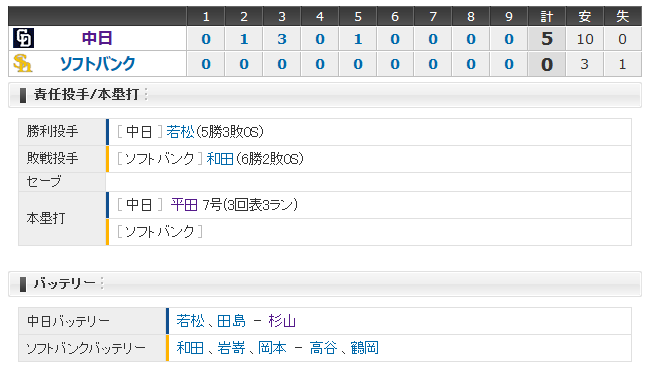 【試合結果】 6/1 中日 5 - 0 ソフトバンク 若松8回無失点!堂上タイムリー、平田3ランで快勝!!