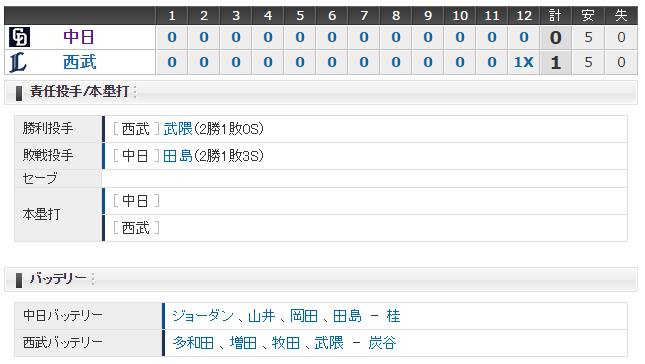 【試合結果】 6/10 中日 0 - 1 西武 延長12回田島打たれてサヨナラ負け・・打線沈黙無得点