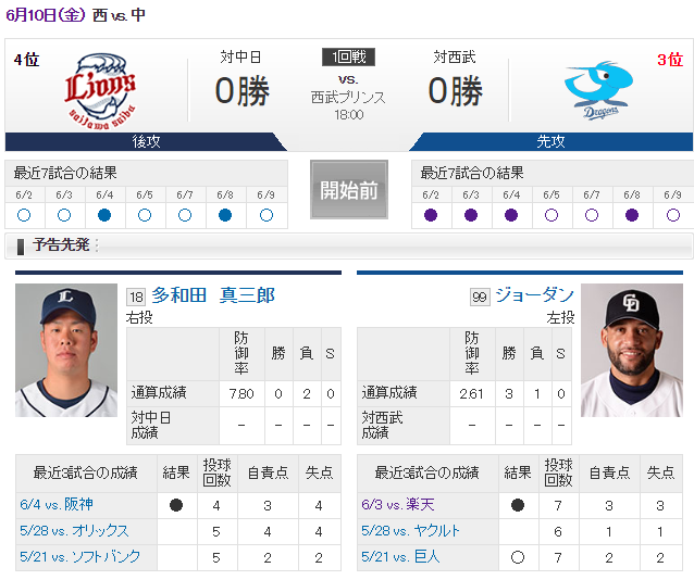【実況・雑談用】 6/10 中日 vs 西武(西武プリンス)18:00開始