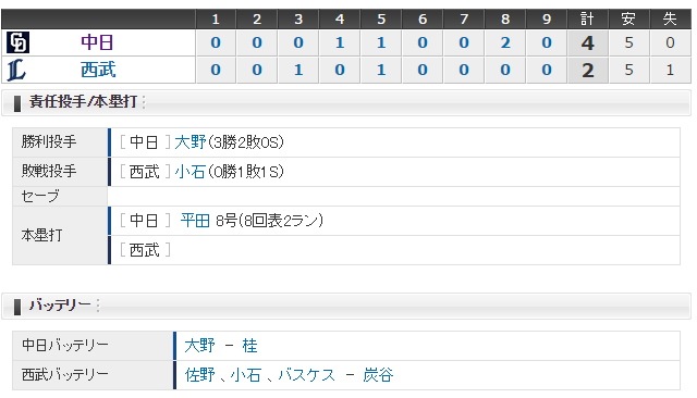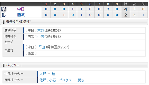 【試合結果】 6/11 中日 4 - 2 西武 大野145球完投で3勝目!平田復帰、勝ち越しHR!!
