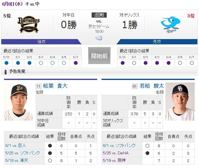 【実況・雑談用】 6/8 中日 vs オリックス(京セラドーム)18:00開始