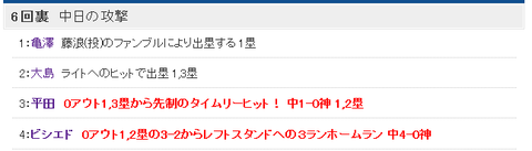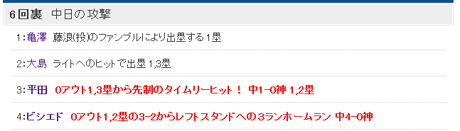 1番亀澤が塁に出て、2番大島がヒットエンドランで繋ぎ、3番平田がタイムリー、4番ビシエドがホームランを打った模様
