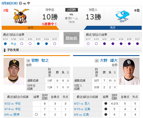 【実況・雑談用】 9/28 中日 vs 巨人(東京ドーム)18:00開始