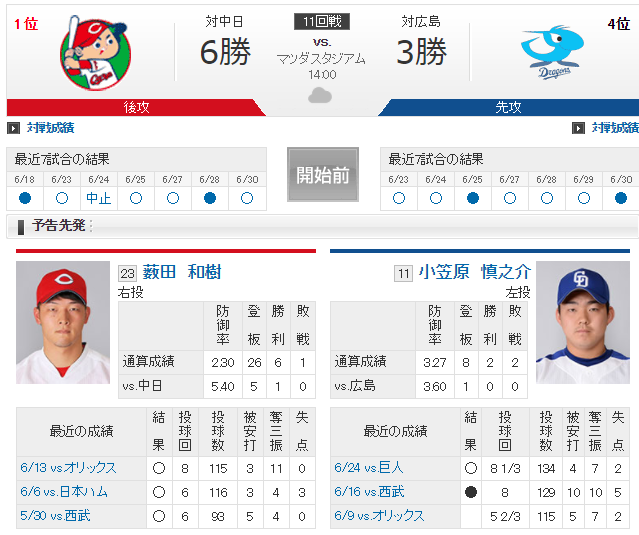 【実況・雑談用】 7/1 中日 vs 広島(マツダスタジアム)14:00開始
