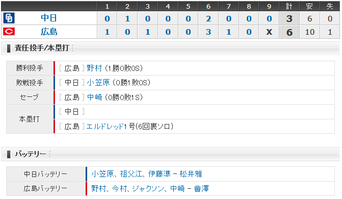 【試合結果】 3/30 中日 3-6 広島 小笠原6回5失点・・初の開幕投手勝利で飾れず