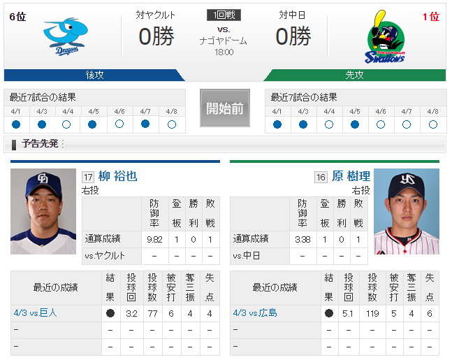 【実況・雑談】 4/10 中日 vs ヤクルト(ナゴヤドーム)18:00開始