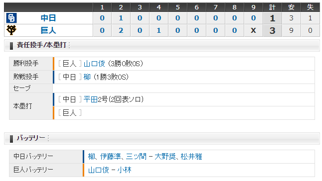 【試合結果】 4/24 中日 1-3 巨人 打線振るわず僅か3安打・・平田の一発のみで連勝ストップ