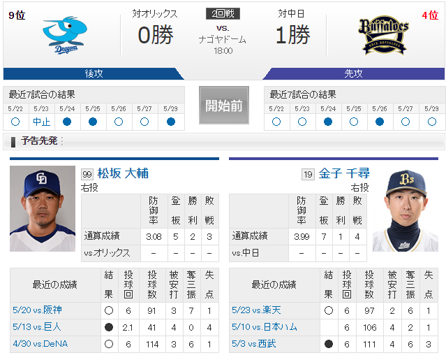 【実況・雑談】 5/30 中日 vs オリックス(ナゴヤドーム)18:00開始