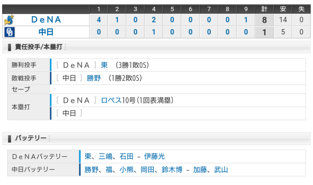 【試合結果】 5/30 中日 1-8 DeNA 勝野7失点KO 痛い連敗..