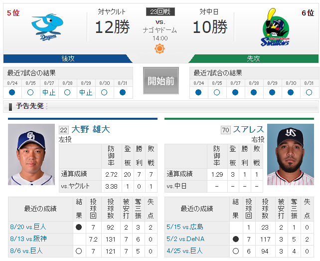 【ドラゴンズ実況】 9/1 中日 vs ヤクルト(ナゴヤドーム)14:00開始