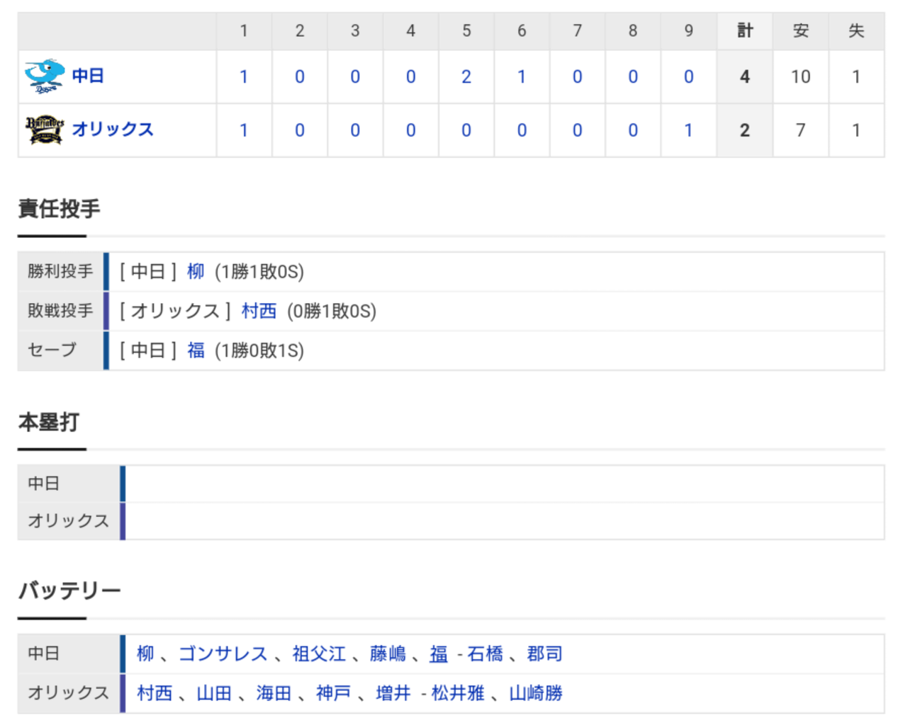 【試合結果】 3/11 オープン戦 中日4 -2 オリックス 連敗ストップ!柳6回1失点!大島平田渡辺にタイムリー