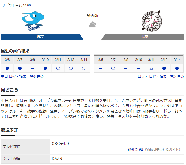【実況・雑談】 3/15 オープン戦 中日vsロッテ(ナゴヤドーム)14:00開始