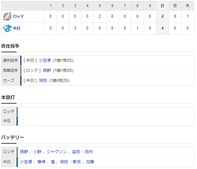 【試合結果】 3/15 オープン戦 中日4-2ロッテ 小笠原は6回2失点 3連勝でオープン戦終了