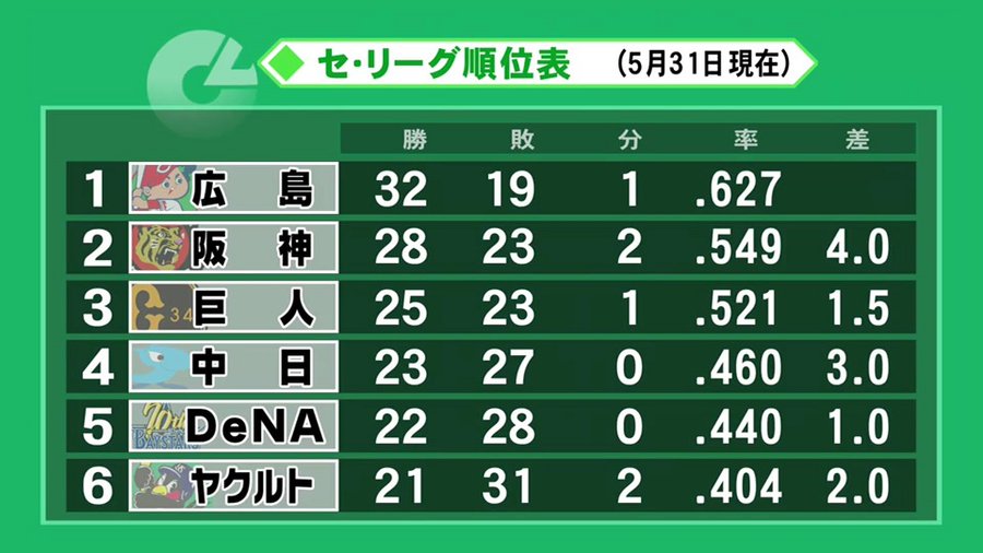 1年前のセ・リーグ順位表 pic.twitter.com/81Vmqac2bl