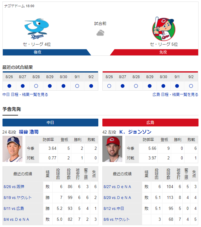 【実況・雑談】 9/3 中日vs広島(ナゴヤドーム)18:00開始