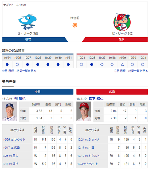 【実況・雑談】 11/1 中日vs広島(ナゴヤドーム)14:00開始