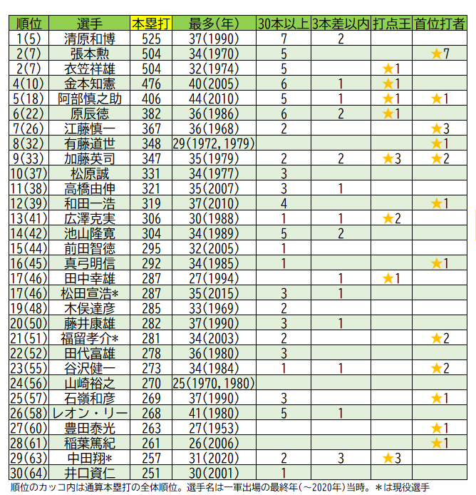 本塁打王獲ってない本塁打数ランキング、3位衣笠、2位ハリー、1位は!