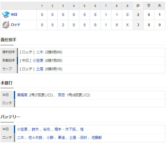 【試合結果】 3/12 オープン戦 中日 2-3 ロッテ 小笠原5回2失点 高橋周、京田にHR