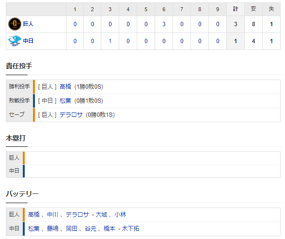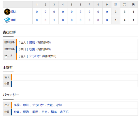 【試合結果】 4/1 中日 1-3 巨人 好投松葉6回捕まり3失点・・打線は援護なく1得点のみ