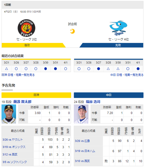 【実況・雑談】 4/2 中日vs阪神(京セラD)18:00~ 先発 福谷-藤浪