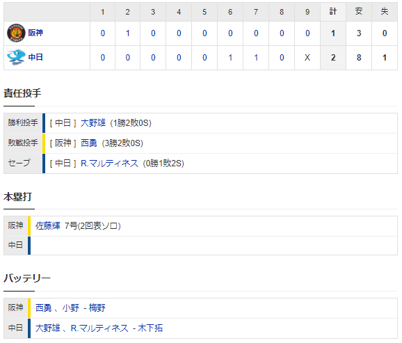 【試合結果】 4/27 中日 2-1 阪神 木下タイムリーで逆転勝ち!大野8回1失点の力投で今季初勝利!