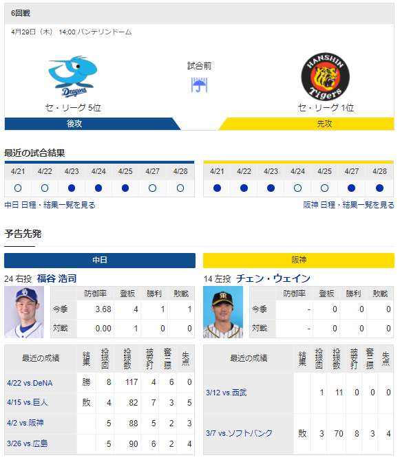 【実況・雑談】 4/29 中日vs阪神(バンテリンドーム)14:00~ 先発 福谷-チェン