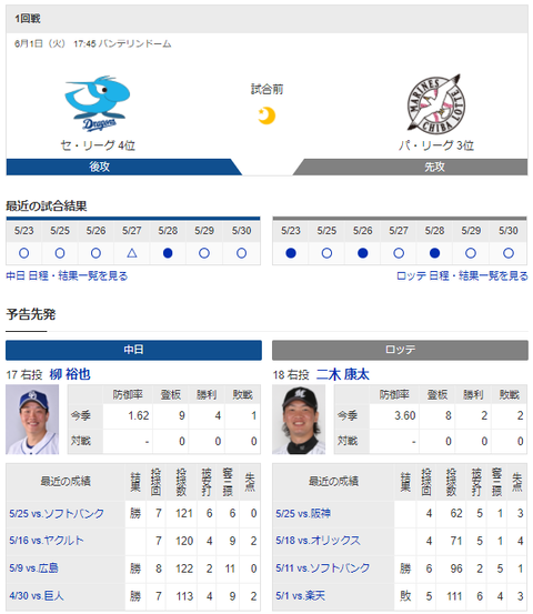 【実況・雑談】 6/1 中日vsロッテ(バンテリンドーム)17:45開始 先発 柳-二木
