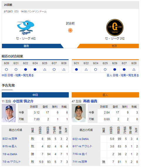 【ドラゴンズ実況】 8/29 中日 vs 巨人(バンテリンドーム)14:00開始