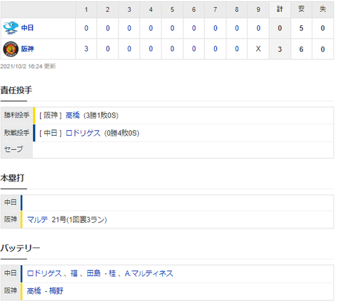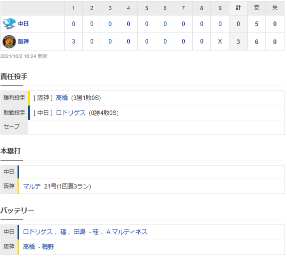 【試合結果】 10/2 中日 0-3 阪神 ロドリゲス初回被弾、打線は無抵抗 完封負けで連敗・・・