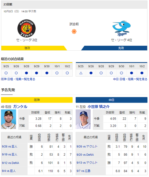 【ドラゴンズ実況】 10/3 中日 vs 阪神(甲子園)14:00開始