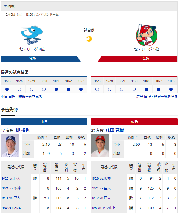 【ドラゴンズ実況】 10/5 中日 vs 広島(バンテリンドーム)18:00開始