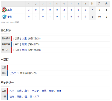 【試合結果】 10/6 中日 3-7 広島 松葉6回5失点 打線ビシエドに久々の一発も及ばず