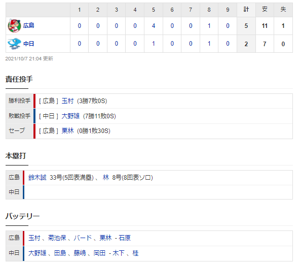 【試合結果】 10/7 中日 2-5 広島 大野痛恨の満塁弾で連敗、、岡林プロ初の3安打猛打賞にタイムリー!