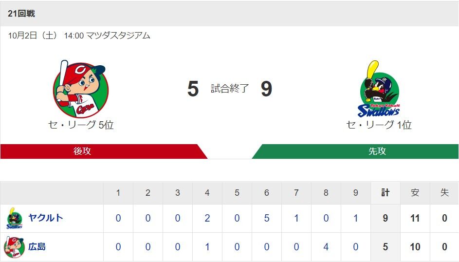 421: 広5-9ヤ(9回裏) 21/10/02(土)17:10:35 ID:XesN