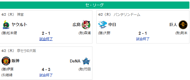 3 阪神 15試合 9勝 5敗 1分 .643 得点51 失点23 本07 盗13 率.235 防1.44 失06